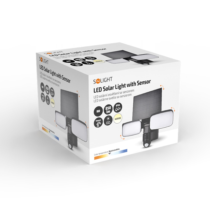 LED solárne svetlo so senzorom, 9W, 850lm, 4000K, Li-Ion, čierna