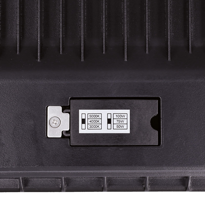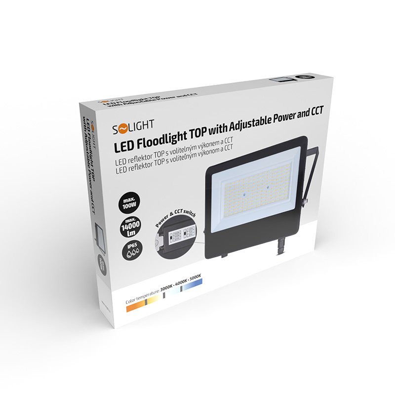 LED reflektor radu TOP s výkonom až 100W a svetelným tokom 14 000 lm je navrhnutý pre náročné aplikácie, kde je potrebná vysoká intenzita svetla. Pomocou prepínača si môžete zvoliť aj úspornejšie režimy na 75W (10 500 lm) alebo 50W (7000 lm), a to bez nutnosti výmeny zariadenia. Možnosť prepínať medzi teplotami svetla 3000/4000/5000 (teplá, neutrálna, studená) prináša maximálne prispôsobenie aktuálnym podmienkam. Svetelný kužeľ so šírkou 120° zaisťuje rovnomerné pokrytie plochy. Reflektor má dlhú životnosť LED čipov až 25 000 hodín, rozmery 280 × 207 × 30 mm a čierny matný povrch, ktorý sa ľahko integruje do každého priestoru. Je vhodný na osvetlenie hál, priemyselných objektov i stavebných priestorov.