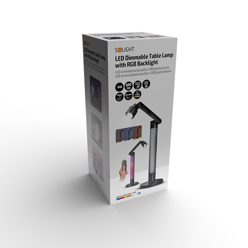 • LED stmievateľná stolná lampička s možnosťou zmeny teploty svetla, s funkciou RGB náladového osvetlenia, zvukovým senzorom a časovačom