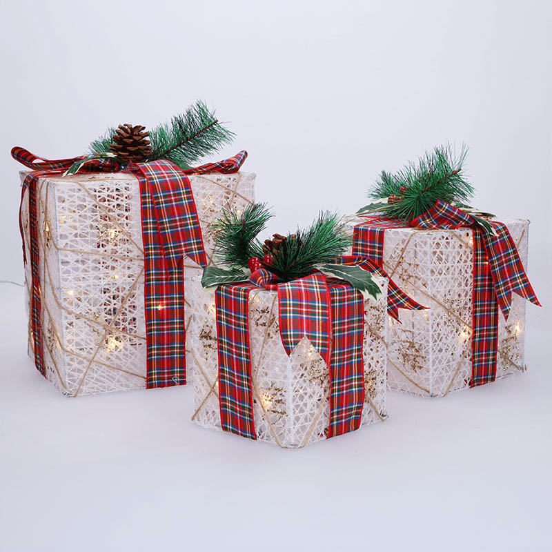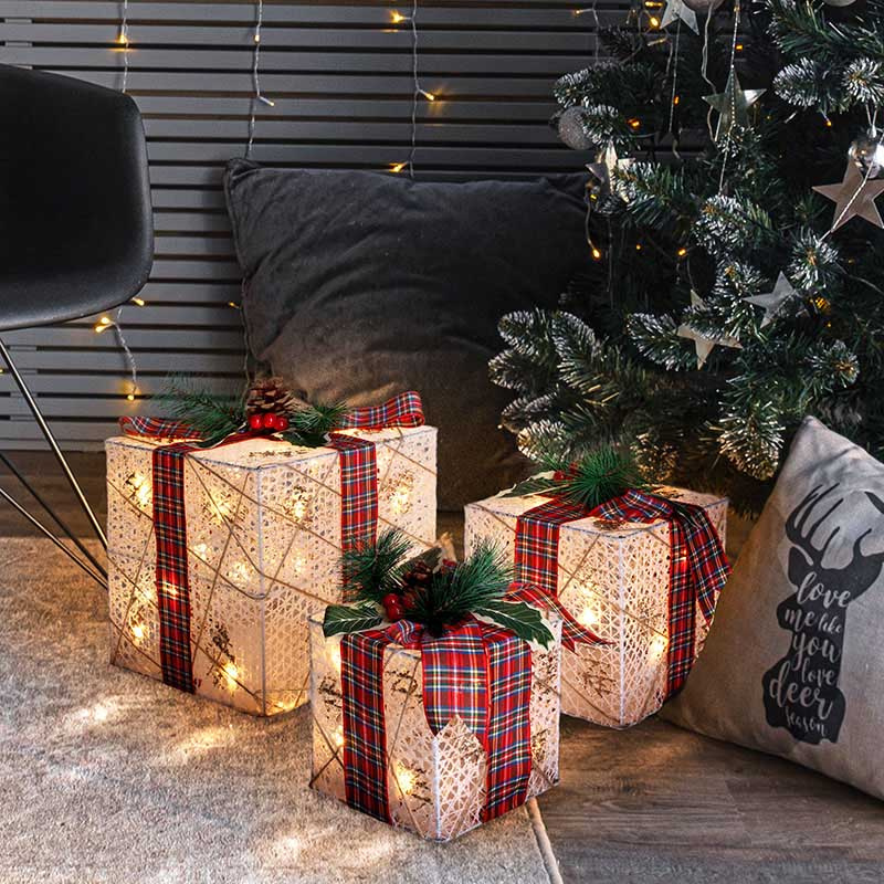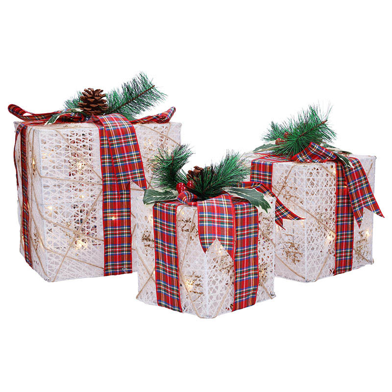 Sada obsahuje tri darčeky rôznych veľkostí (20 cm, 15 cm a 12 cm), ktoré sú osvetlené 48 LED diódami v teplej bielej farbe. Vďaka praktickému časovaču sa svetlá automaticky zapnú na 6 hodín a potom sa na 18 hodín vypnú, čo zaisťuje pohodlné a energeticky úsporné používanie.