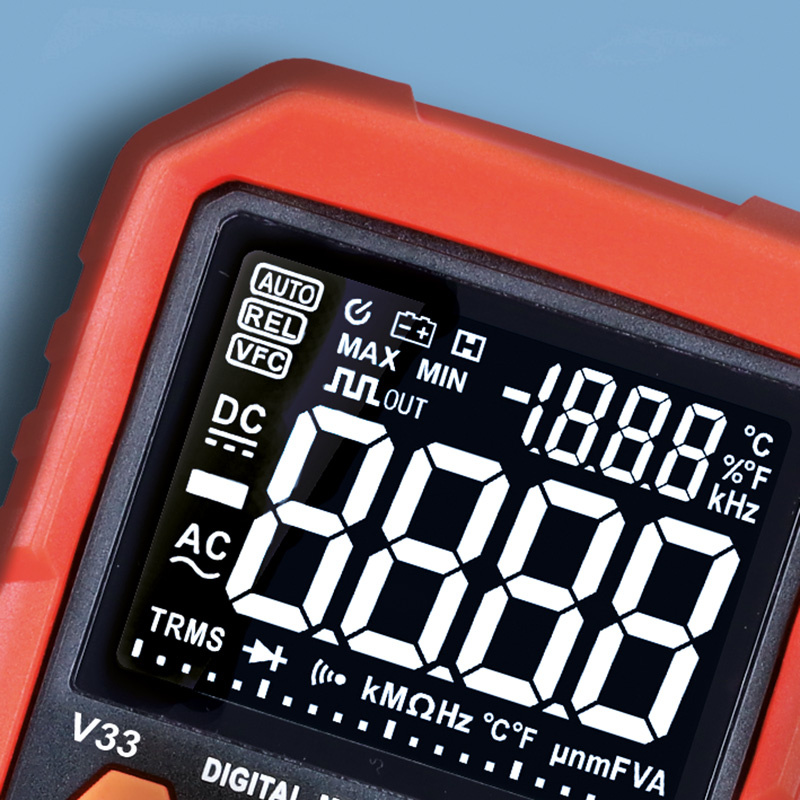 Multimeter with backlit EBTN display (51.5 x 40 mm) for easy readability. Measure DC/AC voltage (400mV - 600V), DC/AC current (400µA - 10A), resistance (400? - 40M?), capacitance (40nF - 40mF) and frequency (4Hz - 10MHz). Temperature from 0°C to 50°C and diode test. Features true RMS, Hold, Min/Max, NCV voltage detection (30V - 1000V), circuit continuity with buzzer. Overload protection and CAT III 600V certification. Power supply: 2x AAA batteries, automatic shutdown after 15 minutes. Dimensions: 155 x 71.9 x 45 mm, weight: 300 g.